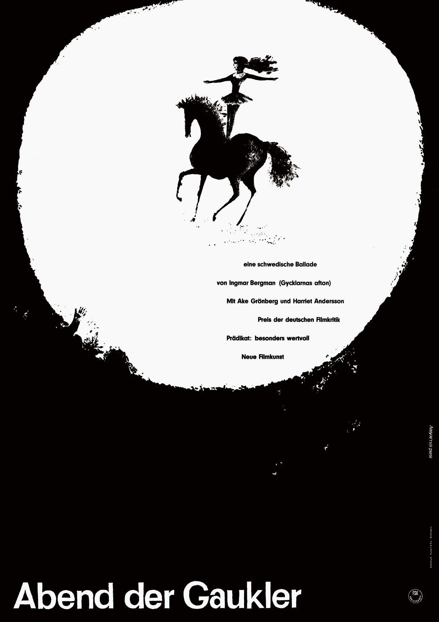 The first posters I made as a student were cut in linoleum. They were then printed by letterpress or screen printing. The big letters, such as the »Sawdust and Tinsel« were cut, the small ones were added by hand. I remember that I was sitting in an attic room, and cutting these linoleum plates on a small table in DIN A1-size. (Hans Hillmann)