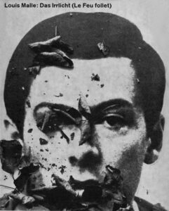Dem Plakat zu »Das Irrlicht« lag eine ziemlich einfache Idee zu Grunde: Der Mann im Film bringt sich um und es sollte ein Bild von Vergänglichkeit entstehen. Da lag es ziemlich nahe, das Portrait zu nehmen und Laub darauf zu streuen. (Hans Hillmann)