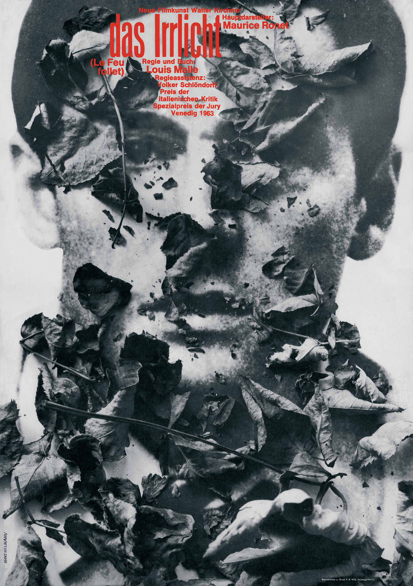 The poster for »The Fire Within« was based on a rather simple idea: The man in the film kills himself and a picture of mortality should be created. So it was quite obvious to take the portrait and put leaves on it. (Hans Hillmann)