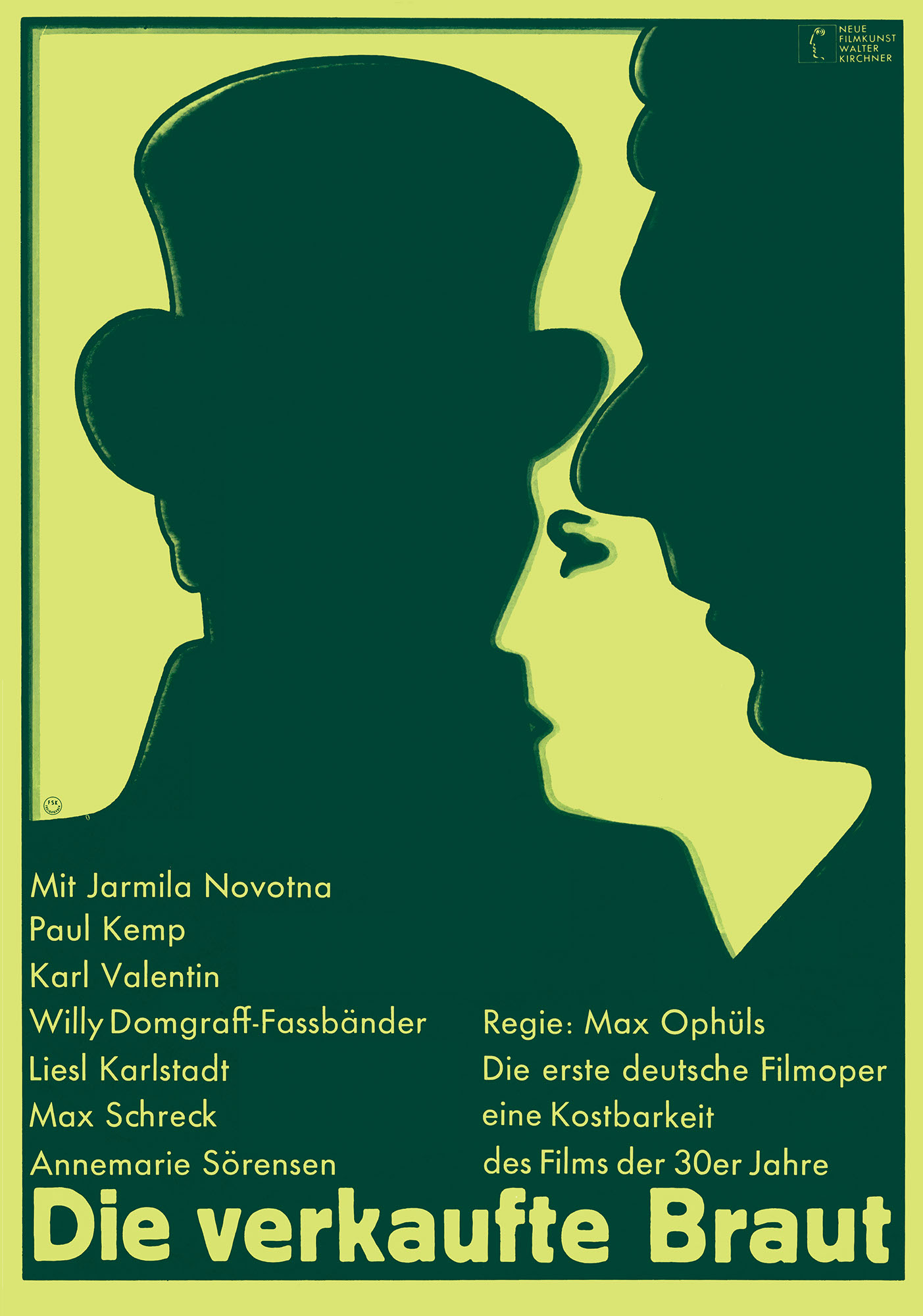 Die verkaufte BrautJahr: 1972Medium: PlakatMaße: 59,4x84,1 cm (DIN A1)Technik: OffsetdruckAuftraggeber: Neue Filmkunst Walter KirchnerOrt: GöttingenKeine Beschreibung